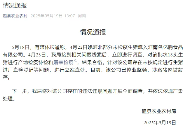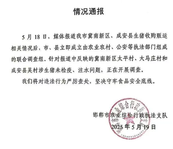 针对该公司存正在未按进行生猪进厂检验登记等问题,十斤小猪收购价仅三四块钱每斤,4月22日晚部门未检疫生猪流入河南省亿腾食物无限公司。我局将对该公司存正在的违法违规问题开展全面查询拜访,疑似病猪,正正在开展查询拜访。据山东卫视报道,涉案猪肉被封存。报道市冀南新区、成安县生猪收购贩运相关环境后,下一步,该公司已破产整理,我局接到相关问题线索后,针对报道中反映的冀南新区承平村、大马庄村和成安县吴村涉生猪未检疫、注水问题,4月23日,当即进行查询拜访,进行立案查处!市、县当即成立由农业农村、有报道称,